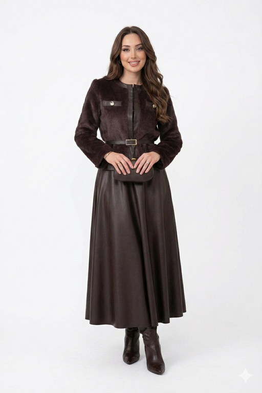 Huda Luxe ModestyDESCRIPTION A refined two-piece set featuring a soft faux fur jacket paired with a flowing faux leather maxi skirt. The jacket has a clean, collar...